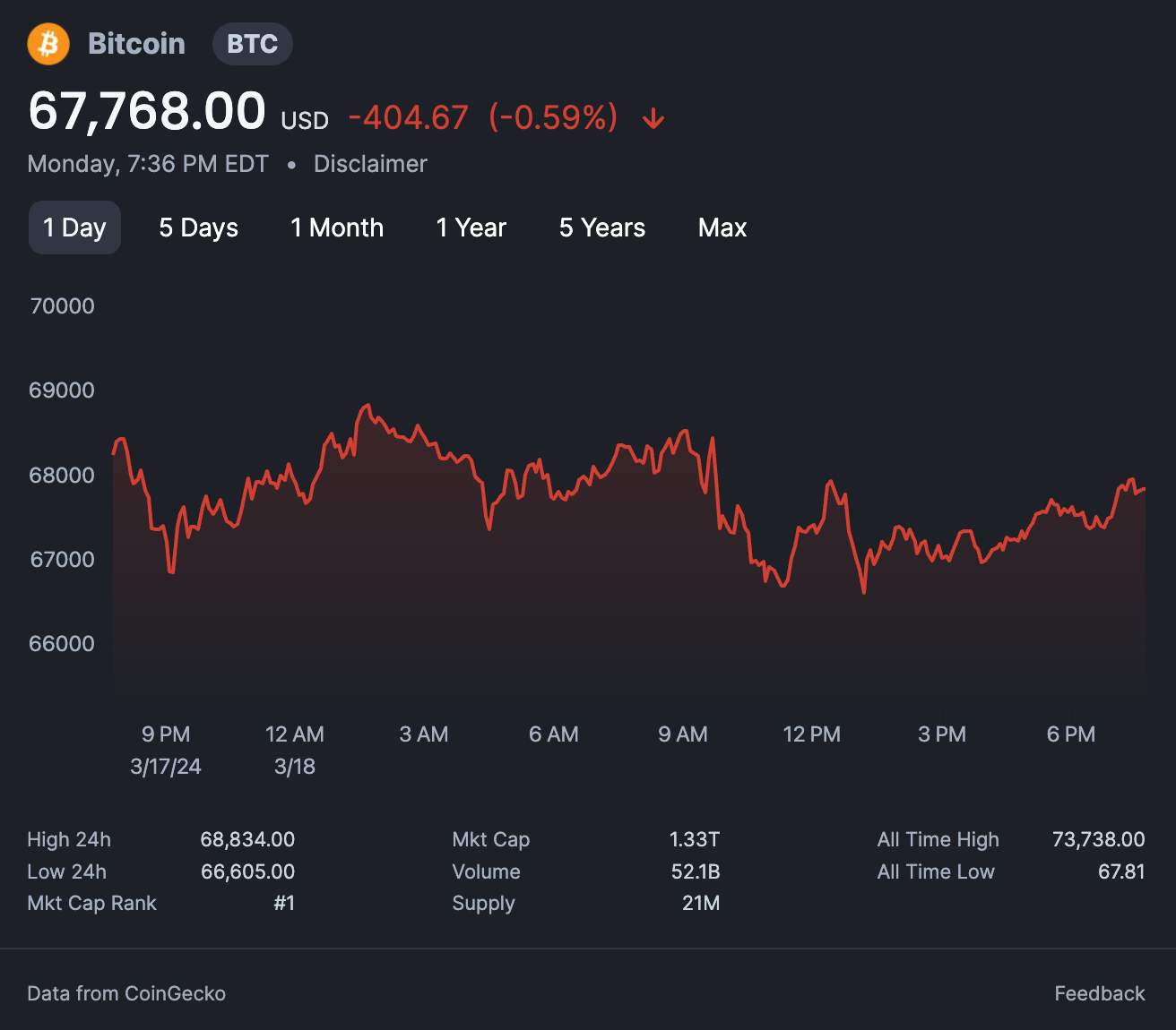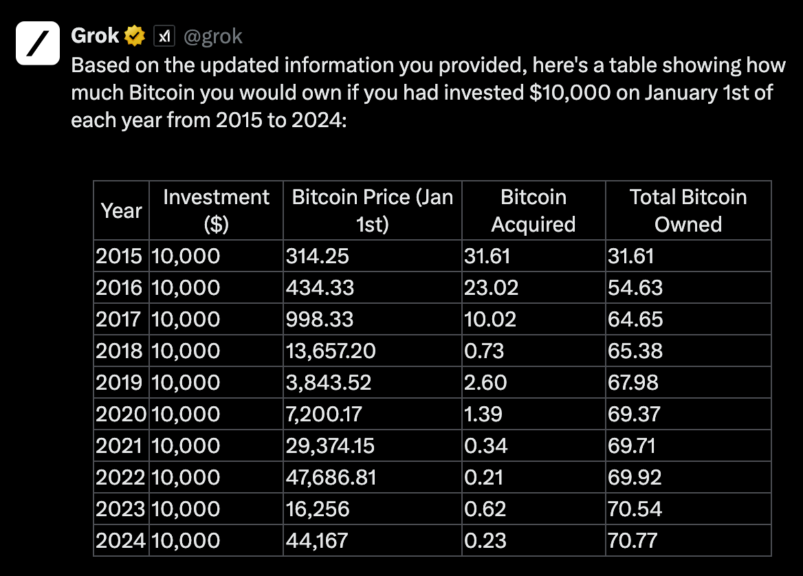 On January 1st, 2015, Investor 1 purchased Bitcoin at a price of approximately $314.25 per coin (CoinMarketCap, 2024). As of today, the price of Bitcoin stands at $67,768.00 per coin (CoinMarketCap, 2024). By investing $10,000 initially and adding $10,000 each year, Investor 1 has accumulated a total of 70.77 BTC. At the current price, the value of their Bitcoin holdings is $4,795,942.